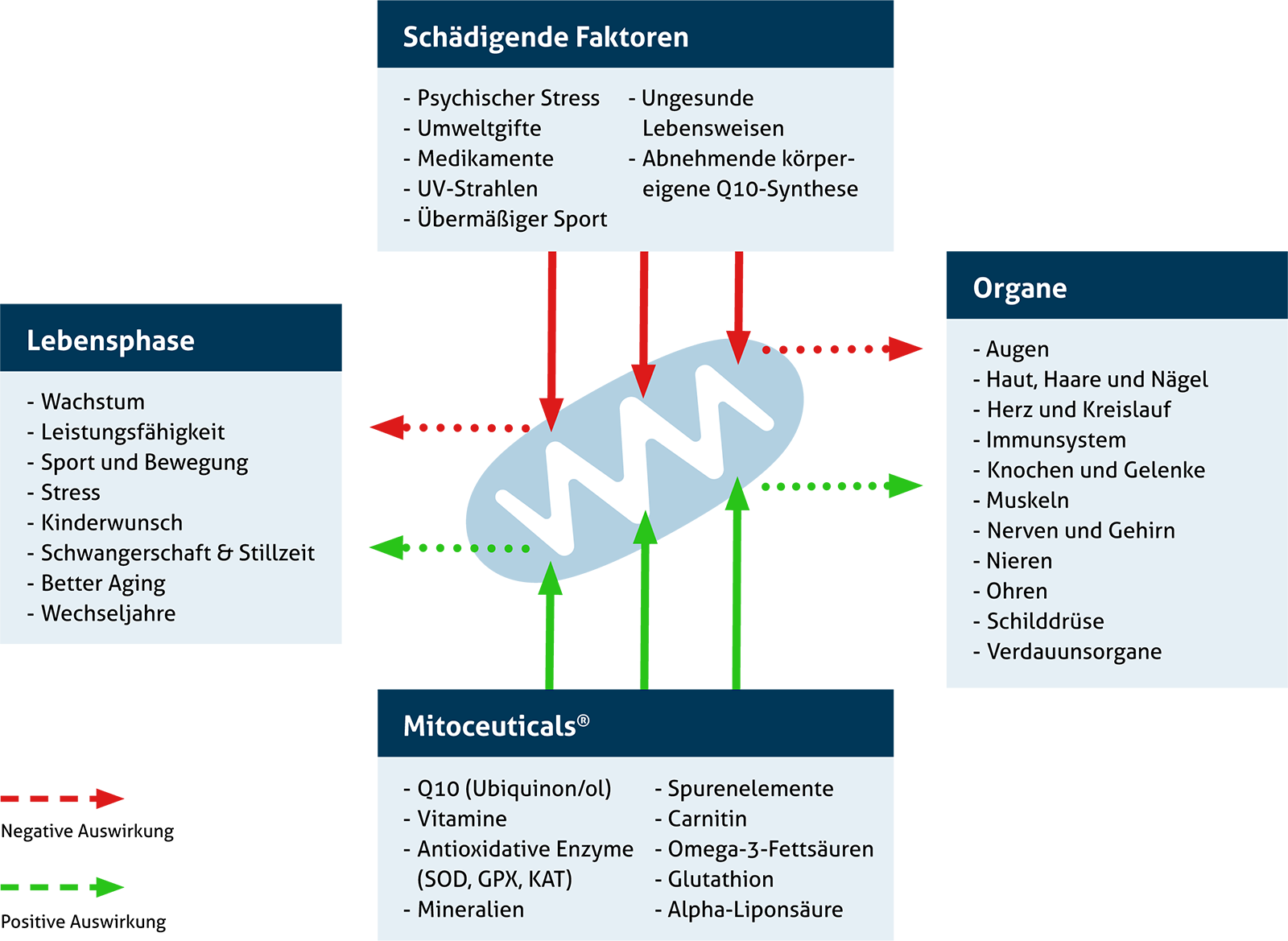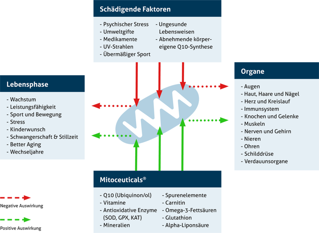 Die Funktion der Mitochondrien, den „Kraftwerken unserer Zellen“, kann durch schädigende Faktoren beeinträchtigt werden. Die gezielte Gabe von spezifischen Vitalstoffen (Mitoceuticals®) vermag jedoch die Mitochondrien zu schützen und zu aktivieren.